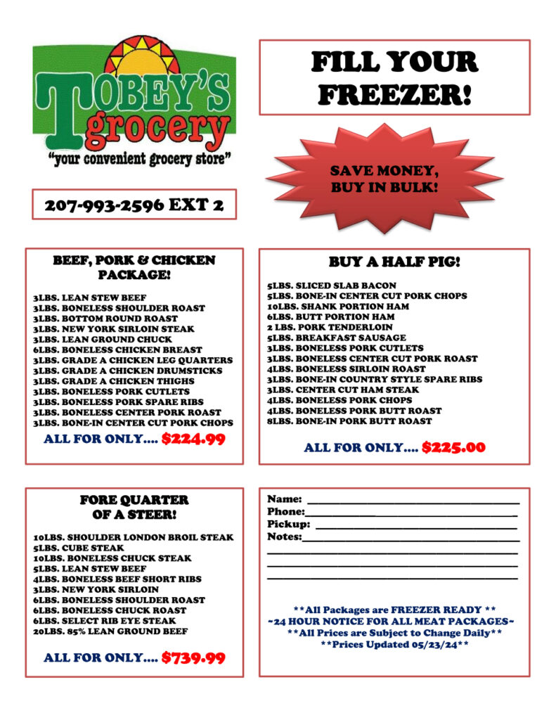 Tobey’s Butcher Box is the perfect way to fill your freezer at the absolute best price! Portioned, vacuum sealed, and processed right here in the store, we save you both time and money!